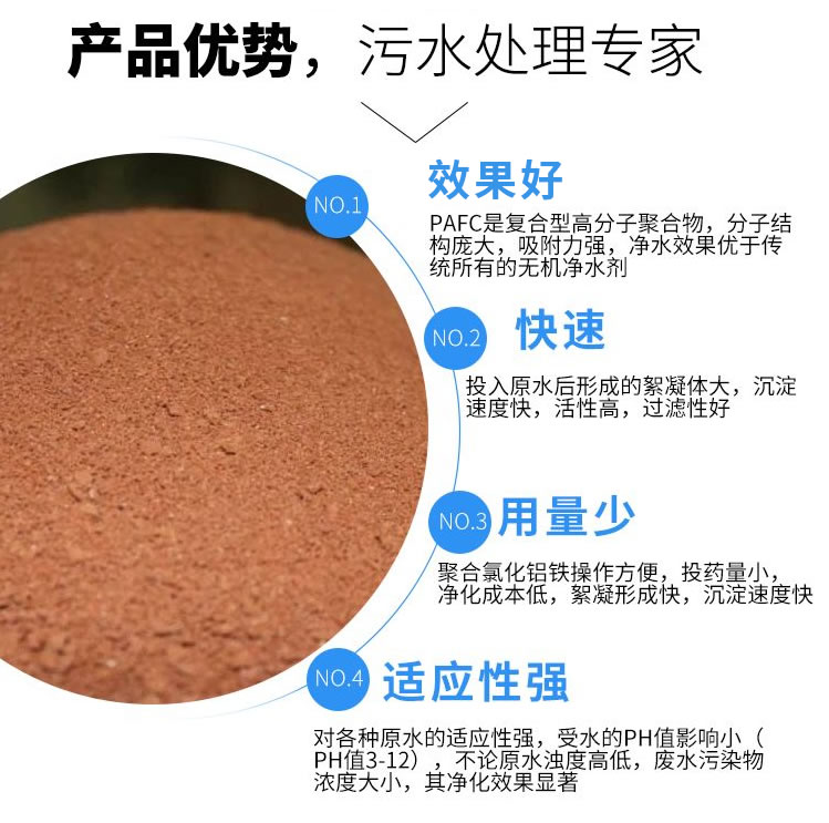 聚合氯化铝铁可用于生活饮用水、工业用水及工业废水、生活污水处理,混凝效果除表现为剩余浊度色度降低外,还有絮体形成块,吸附性能高,泥渣过滤脱水性能好等特点,特别是在处理高浊度水时,低温低浊度水时效果特别明显,可不加碱性助剂和其它混凝剂无法比拟的效果。
