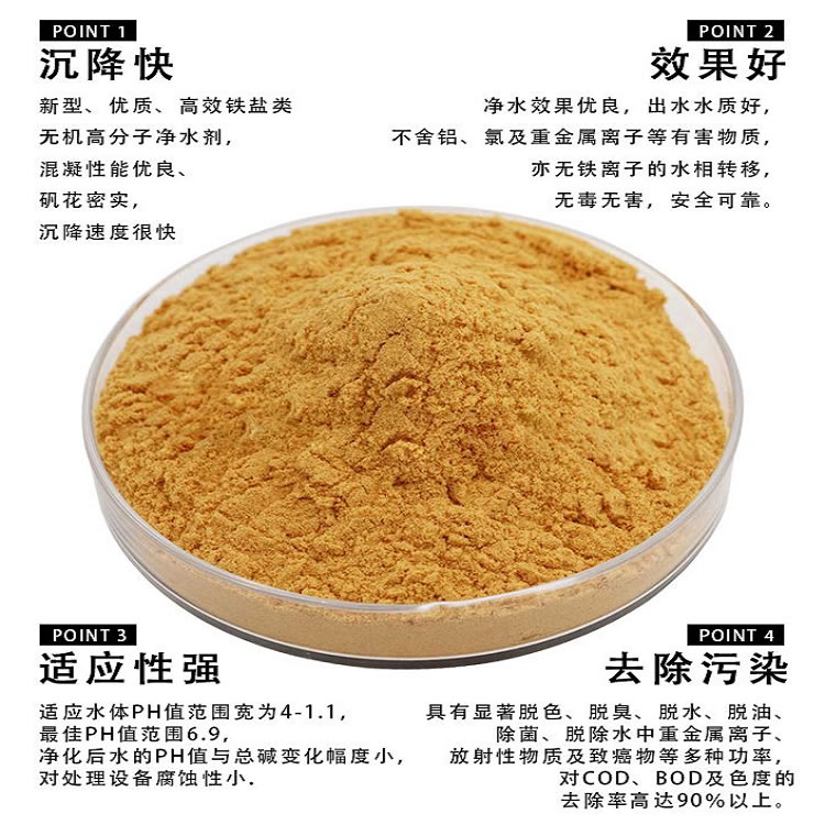 1、新型、优良、铁盐类无机高分子絮凝剂。
